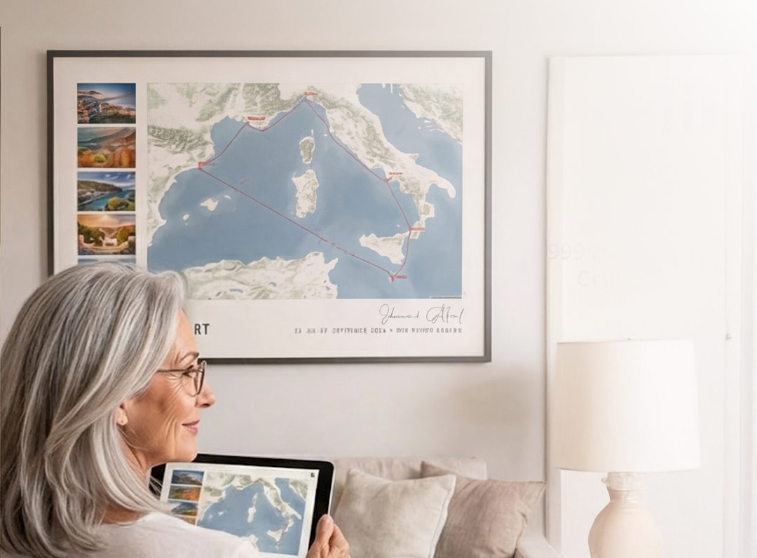 Deine fertige CruiseMap kannst du auf verschiedene Arten erhalten: Digital zum Teilen, als hochwertigen Druck, Fotopuzzle, etc.