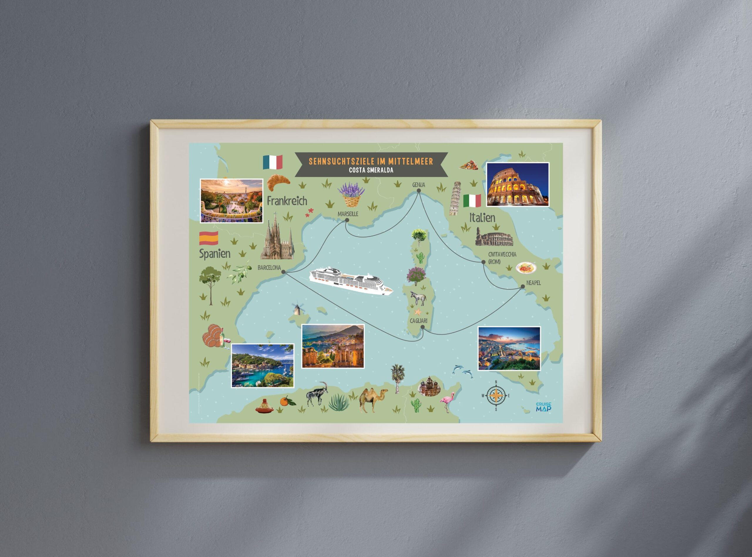 Wähle einfach die von dir befahrene Route und dein Schiff aus wie zB. die Costa Smeralda, MSC Grandiosa u.a. und entscheide dich für eines der passenden See-Karten-Designs.
