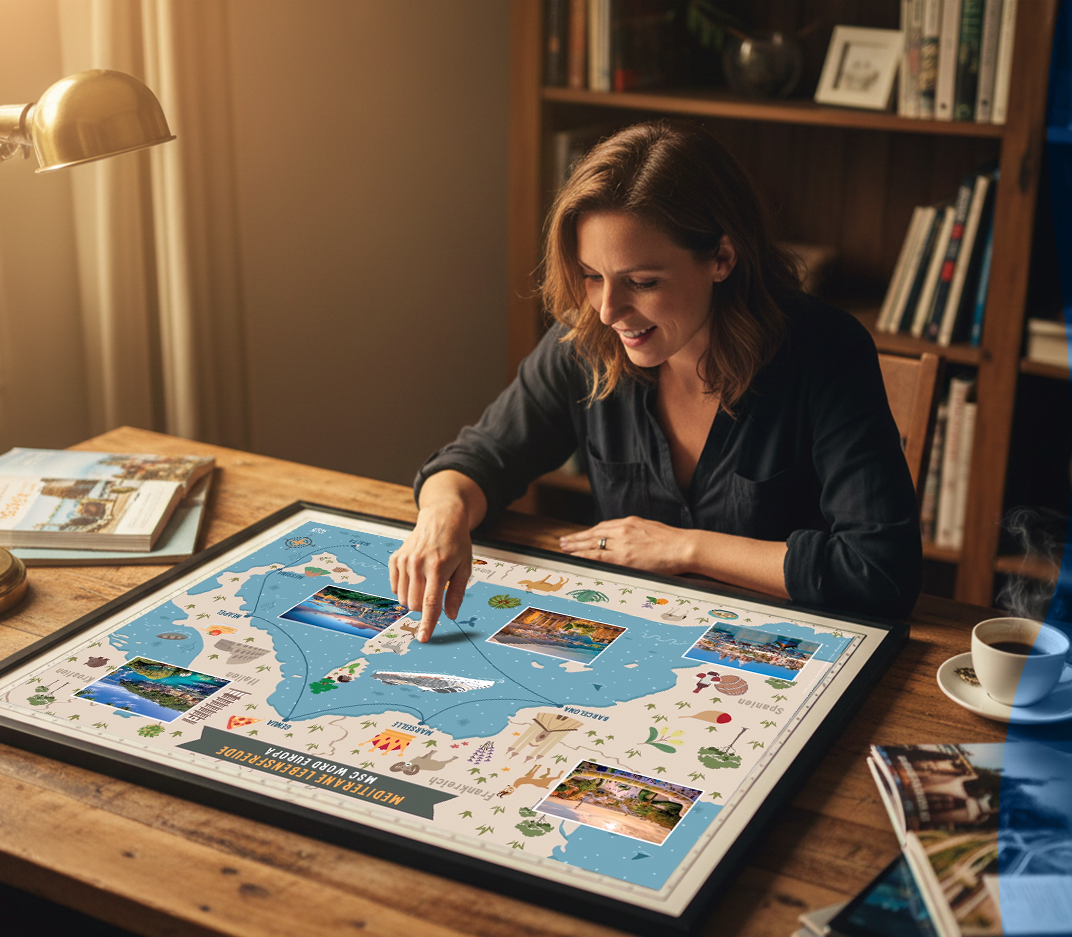 Die Erinnerung an eine gelungene, harmonische Kreuzfahrt ist wunderbar. Mit deiner persönlichen CruiseMap schaffst du ein eindrucksvolles Erinnerungsstück, welches noch lange nachklingt und dir, deine Freunden, Familie und Gästen das Glück auf den Wellen nach Hause bringt